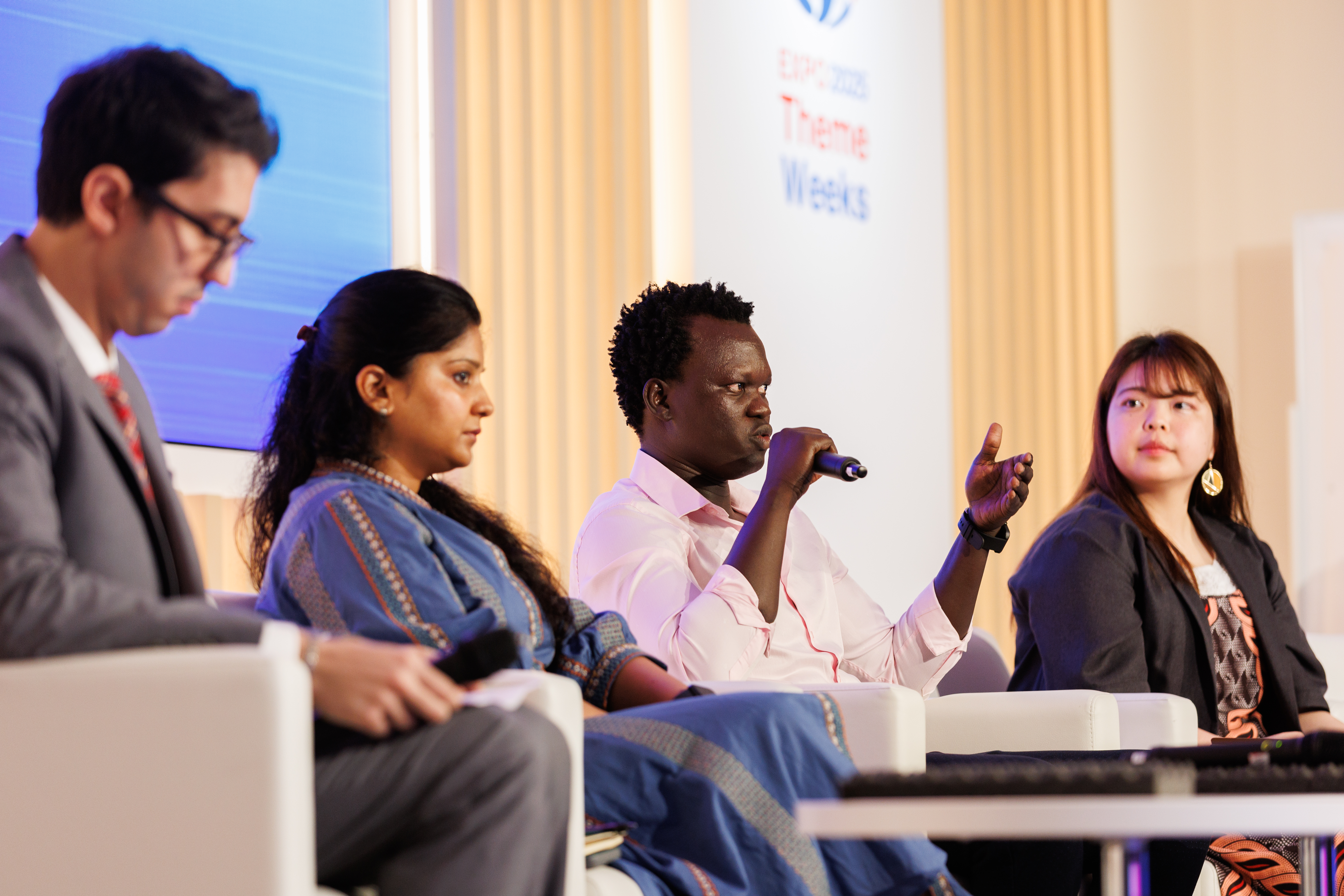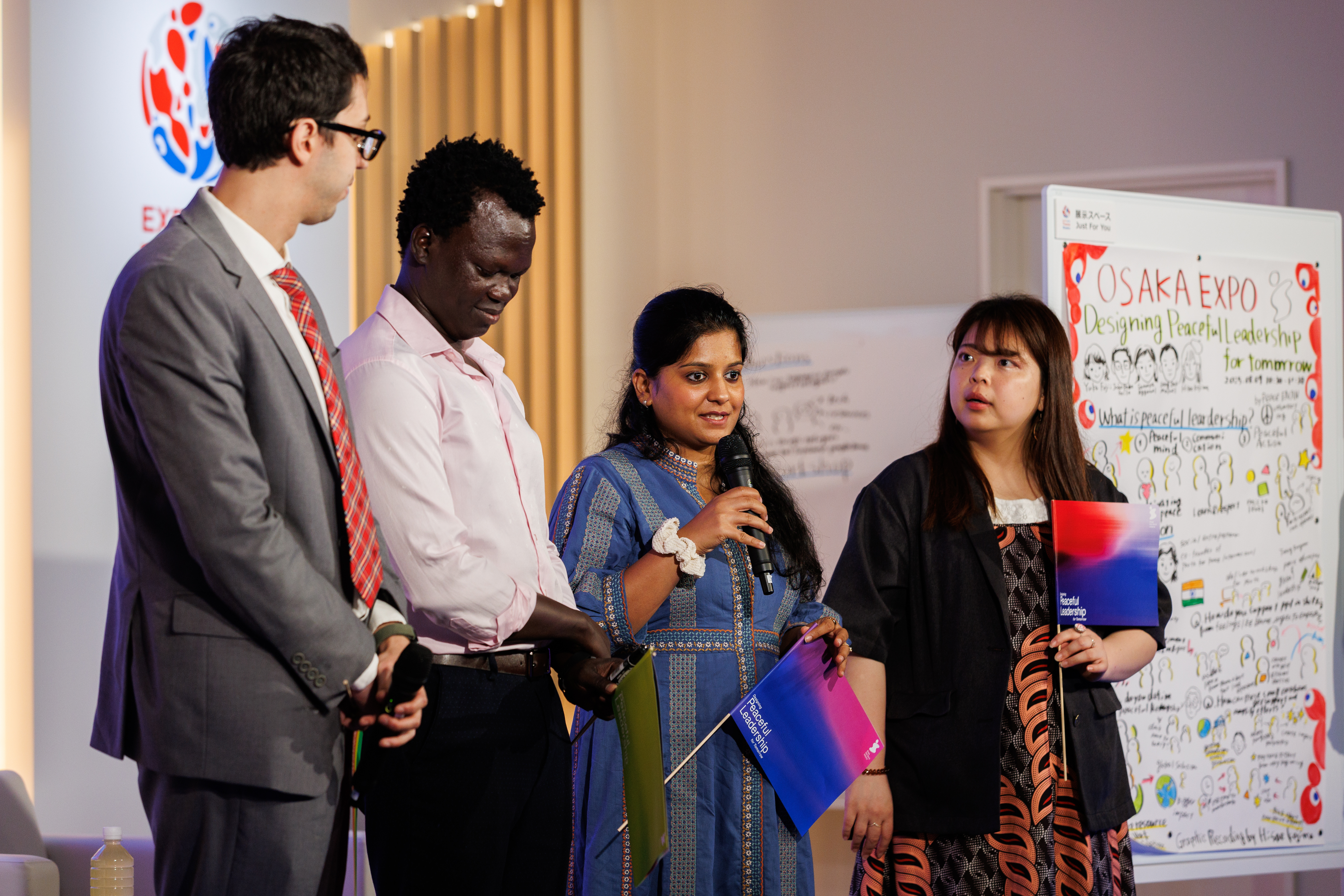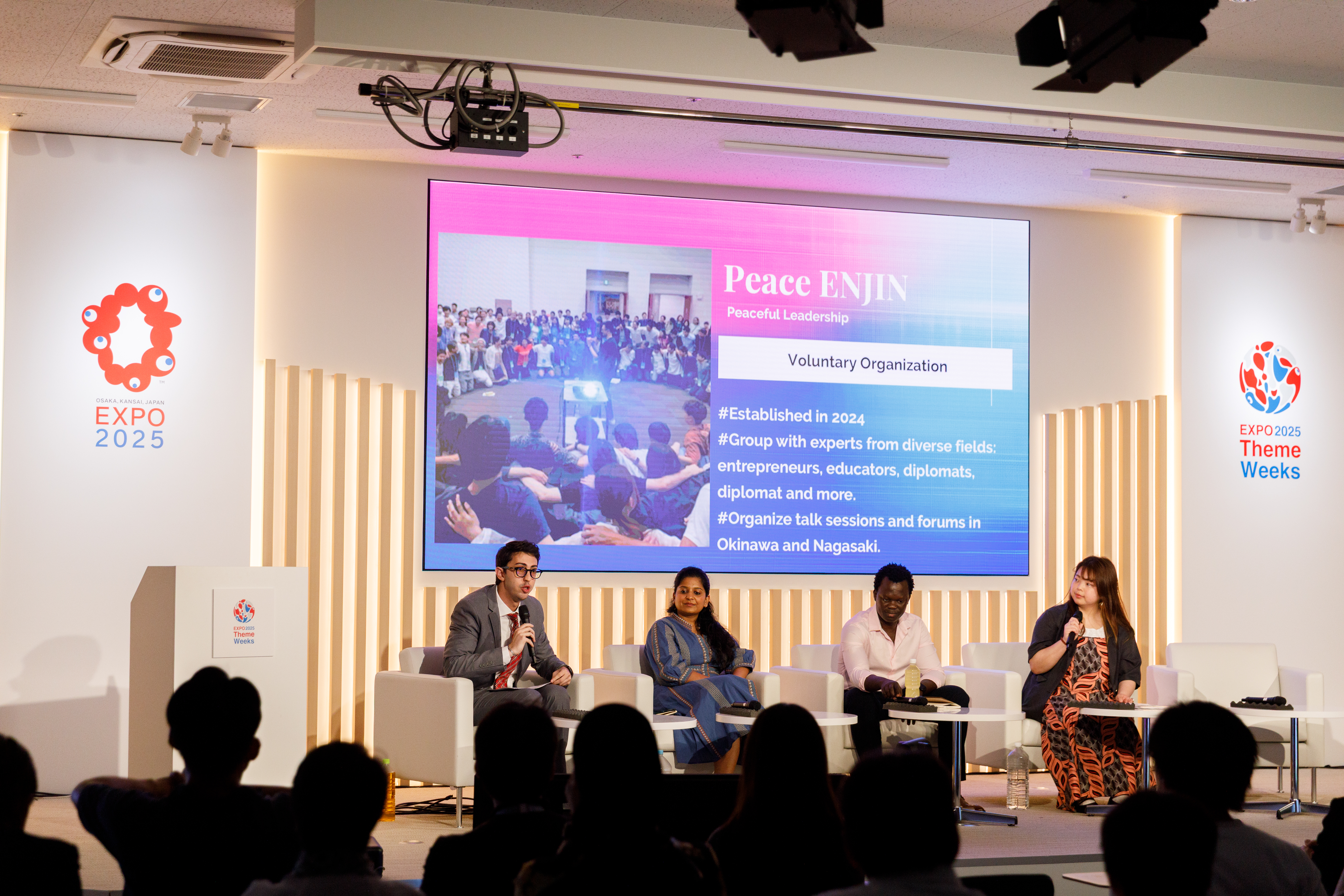 The first half of the program featured a panel discussion based on the concept of “Peaceful Leadership” proposed by the volunteer group PEACE ENJIN. Ms. Saumya Aggarwal from the United Network of Young Peacebuilders (UNOY) shared her experiences supporting young people who had fled conflict zones, emphasizing that “meeting, understanding, and engaging with people from different backgrounds as fellow human beings is the key to transforming negative emotions into a force for peace.” Mr. Deng Dak Malual, the Global Shapers Kakuma Hub who grew up in the Kakuma Refugee Camp in Kenya, added, “Support from Japan—such as sending unused computers and providing mentors who can accompany and guide young people—can make a significant impact.”
