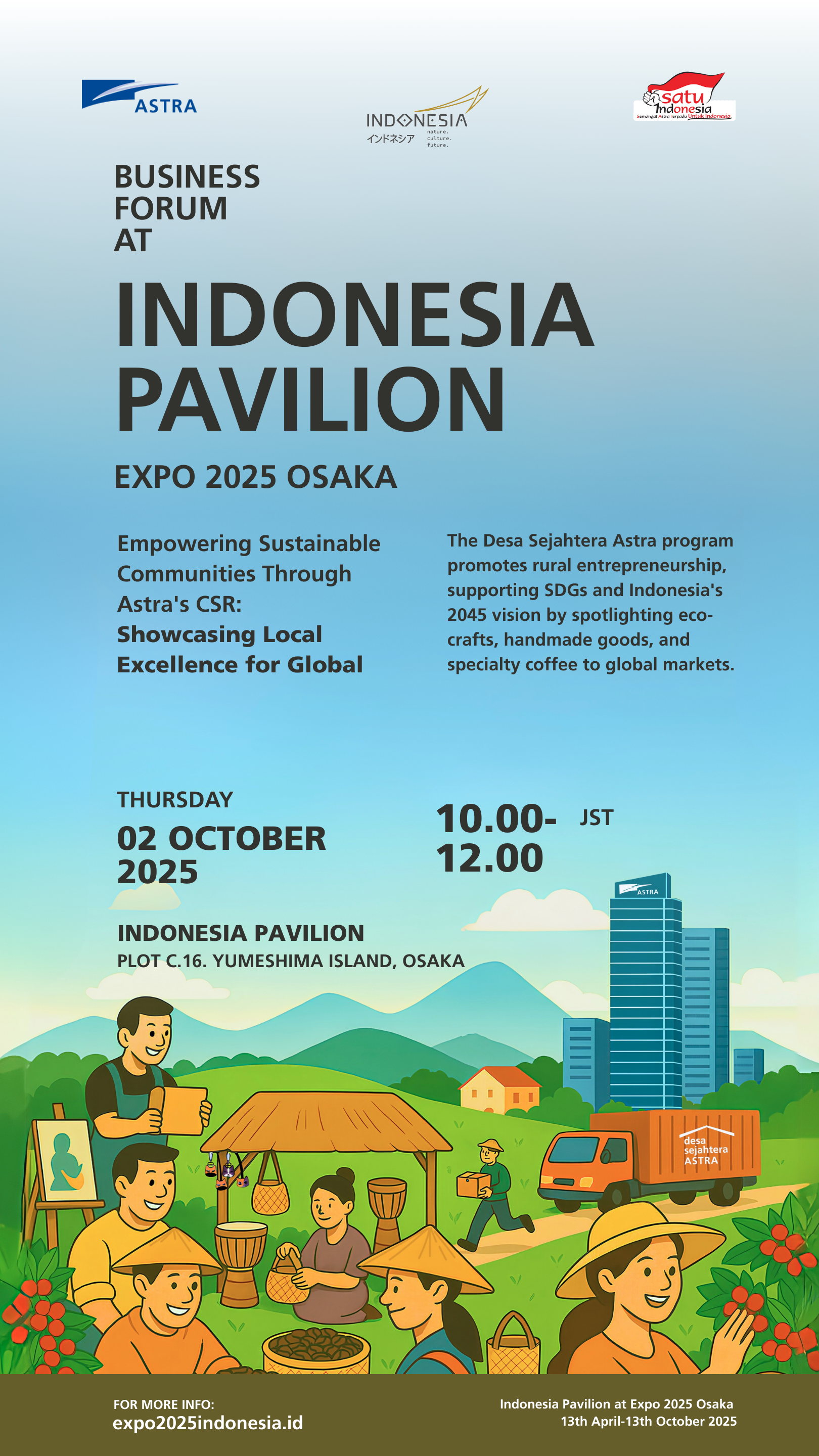 The Business Forum at Osaka Expo 2025, themed “Empowering Sustainable Communities Through Astra’s CSR: Showcasing Local Excellence for Global,” will take place on Tuesday, October 7, 2025, from 16:00 to 18:00 JST. Organized by Bappenas and PT Astra International Tbk, the event will highlight Astra’s Corporate Social Responsibility (CSR) initiatives across four pillars: health, education, environment, and entrepreneurship. The focus on entrepreneurship aligns with Indonesia’s Vision 2045 and the UN Sustainable Development Goals (SDGs), particularly in eradicating poverty and promoting decent work and economic growth. Astra’s flagship program, Desa Sejahtera Astra (DSA), will showcase innovative products from its community partners, including eco-friendly woven bags from Sumatra Barat, traditional djembe drums, and high-quality leather keychains etc. The forum aims to connect local artisans and small businesses with global buyers, distributors, and investors, fostering sustainable trade and economic empowerment. Through this initiative, Astra strengthens its commitment to sustainable business ecosystems, ensuring Indonesian craftsmanship gains international recognition. The event will serve as a dynamic platform for networking, knowledge exchange, and fostering long-term partnerships in sustainable community development.