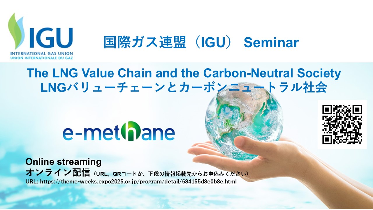 Focusing on liquefied natural gas (LNG) as an energy source with low environmental impact, this seminar will introduce and discuss in an easy-to-understand manner the technologies, systems, and global trends related to e-methane, as a renewable energy source, and the gas industry's efforts towards the realization of a carbon neutral society. Presented by: Chair of IGU LNG Committee: Atsuo Kanno (Osaka Gas)