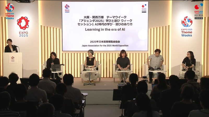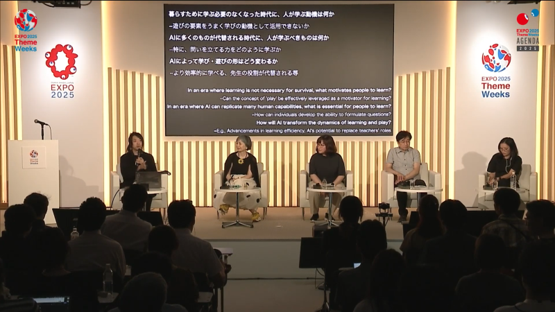 本プログラム「AI時代の学び・遊びのあり方」は、大阪・関西万博テーマウィーク「学びと遊びウィーク」の一環として、2025年7月28日10:00〜12:00に開催された。モデレーターはメディアアーティストの落合陽一氏。パネリストとして、学習科学者・公立はこだて未来大学教授の美馬のゆり氏、Sakana AI株式会社リサーチ科学者のタリン・カラーヌワット氏、東京大学およびソニーコンピュータサイエンス研究所の暦本純一氏、ELSA Corp共同創設者・最高経営責任者のヴァン・ディン・ホン・ヴ氏が登壇した。本セッションでは、急速に進化するAI技術が人間の学びや遊びのあり方に与える影響を多角的に検討し、未来社会における学び・遊びの価値と意味を探った。AIの発展により生活の多くが自動化される中で、人間がなぜ学び、どのように遊ぶのかという根源的な問いを共有し、各分野の専門家が具体的な実践例や研究成果を通じて議論を展開した。