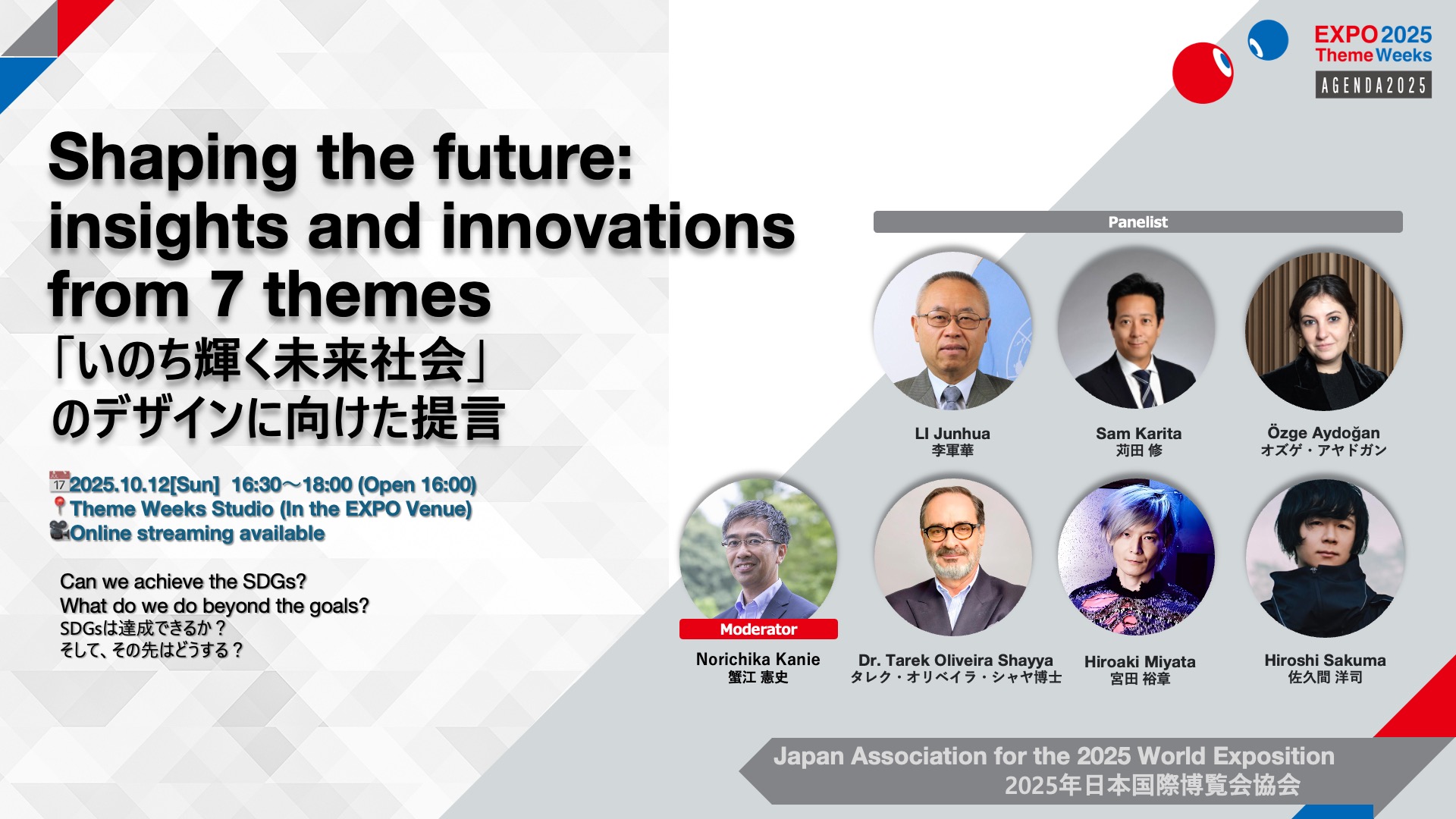 本プログラムは、テーマウィーク全体協賛者と連携して博覧会協会が企画・実施する「アジェンダ2025」の一つです。「SDGsは達成できるか?そして、その先はどうする?」というセントラルクエスチョンを中心に、トークセッションが展開されます。