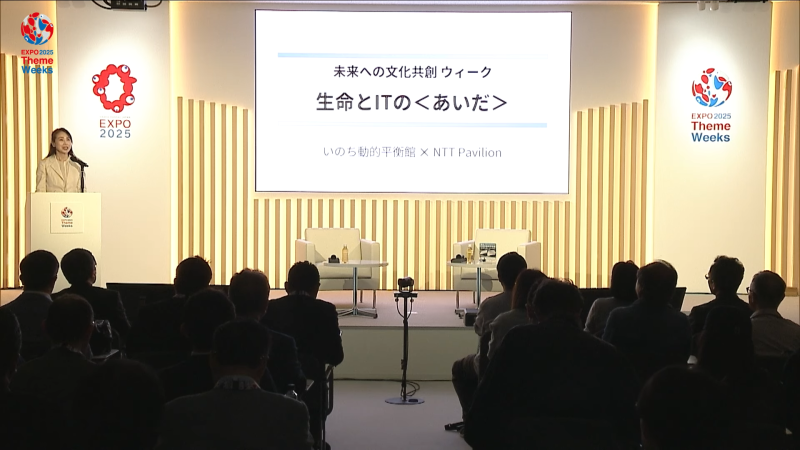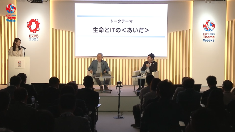 NTTの澤田純会長と「万博で作り出したい新しい文化」などについて語り合いました。またNTTでは企業パビリオンを出展しており、次世代情報通信基盤「IOWN」(アイオン)による空間伝送技術が注目されています。NTT館といのち動的平衡館のあいだではIOWNを利用した「ふれあう伝話」を設置していたこともあり、NTTが手掛けてきたコミュニケーション手段の発達や、世界を席巻するAIの在り方についても盛り上がりました。生命や科学技術、ITと生命の関係はどうあるべきかなどの話題は、来場者にも興味を持って聞いてもらえたのではないでしょうか。