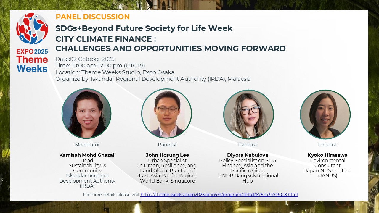 気候変動対策で都市の役割は重要であり、都市は世界のエネルギーの78%を消費し、温室効果ガスの60%以上を排出しています。2050年までに世界人口の68%が都市に居住すると予測され、都市の変革が不可欠です。2023年、イスカンダル・マレーシアを含むマレーシアの8都市がCity Climate Finance GAP Fundを活用し、低炭素化と洪水リスク管理を推進しました。2025年大阪万博では、これらの取り組みや国際連携が議論され、脱炭素目標達成への道が探られます。※すべての登壇者がオンライン参加を予定しています。