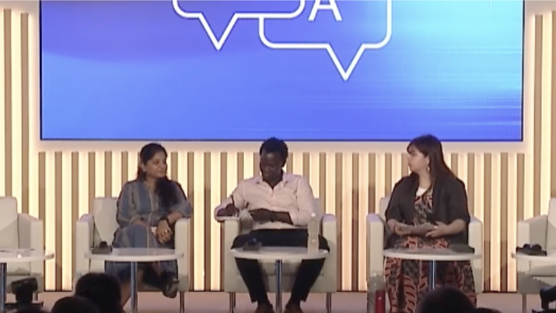 前半は任意団体PEACE ENJINの概念を起点にしたパネルディスカッションです。国際若手平和構築ネットワーク(UNOY)のサウムヤ・アガラワル氏は、紛争から逃れた若者の支援経験から「異なる背景をもつ人を理解し、人として向き合うことが感情を平和の力に変える鍵です」と語りました。ケニアにあるカクマ難民キャンプで育ったグローバル・シェイパーズカクマハブのデング・ダク・マルアル氏は、「日本で不要になったパソコンの提供や、若者を支えるメンターの存在が大きな力になります」と述べました。