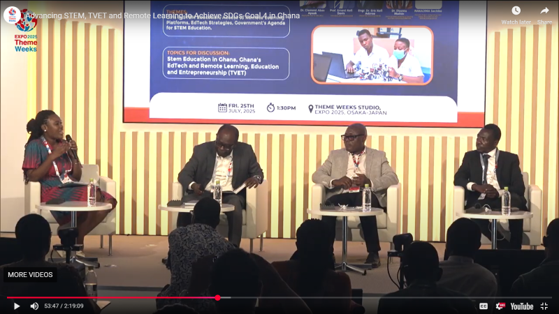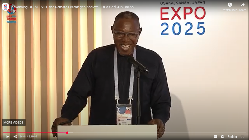 2025年7月25日に開催された「ガーナにおけるSDGs目標4の達成に向けたSTEM、産業人材育成・職業技術訓練(TVET)、遠隔学習の推進」と題されたテーマウィークプログラムでは、ガーナの教育分野における主要関係者が一堂に会し、イノベーションによる教育環境の変革に向けた国の取り組みが紹介されました。2025年大阪・関西万博のテーマウィークの一環として開催されたこのプログラムは、SDG4「質の高い教育」の達成に向けた同国の戦略的取り組みを強調しました。