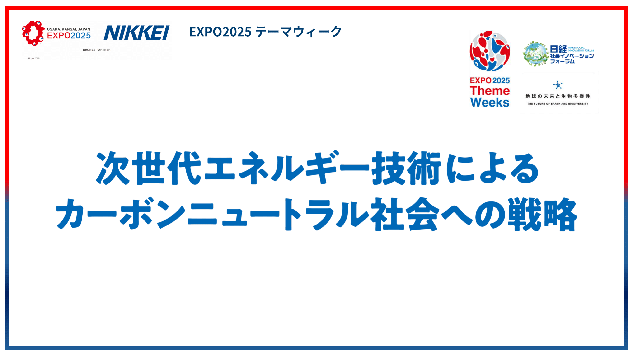 第7時エネルギー基本計画や「GX2040ビジョン」など再生可能エネルギーを中心とした次世代エネルギーを中心としたGXの取り組みによって、国内における経済成長が期待されます。万博というグローバルのへ発信する場所で、次世代エネルギーの未来を切り開く、政策支援、企業による技術革新について、発信します。