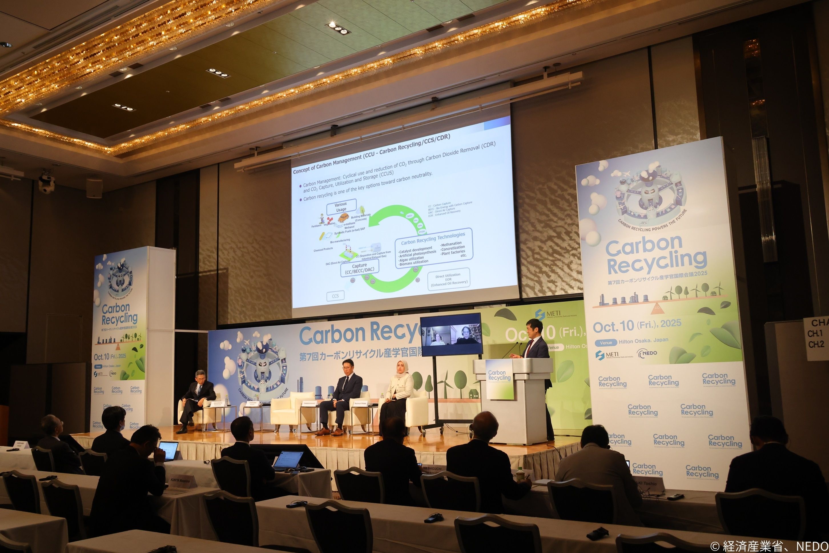 7回目の開催となる本会議では、(1)社会全体での排出抑制につながるカーボンリサイクル分野での国際連携、(2)2030年に向けたカーボンリサイクル技術の方向性、(3)カーボンリサイクル市場の形成に向けたビジネスモデルをテーマにパネルディスカッションが行われました。