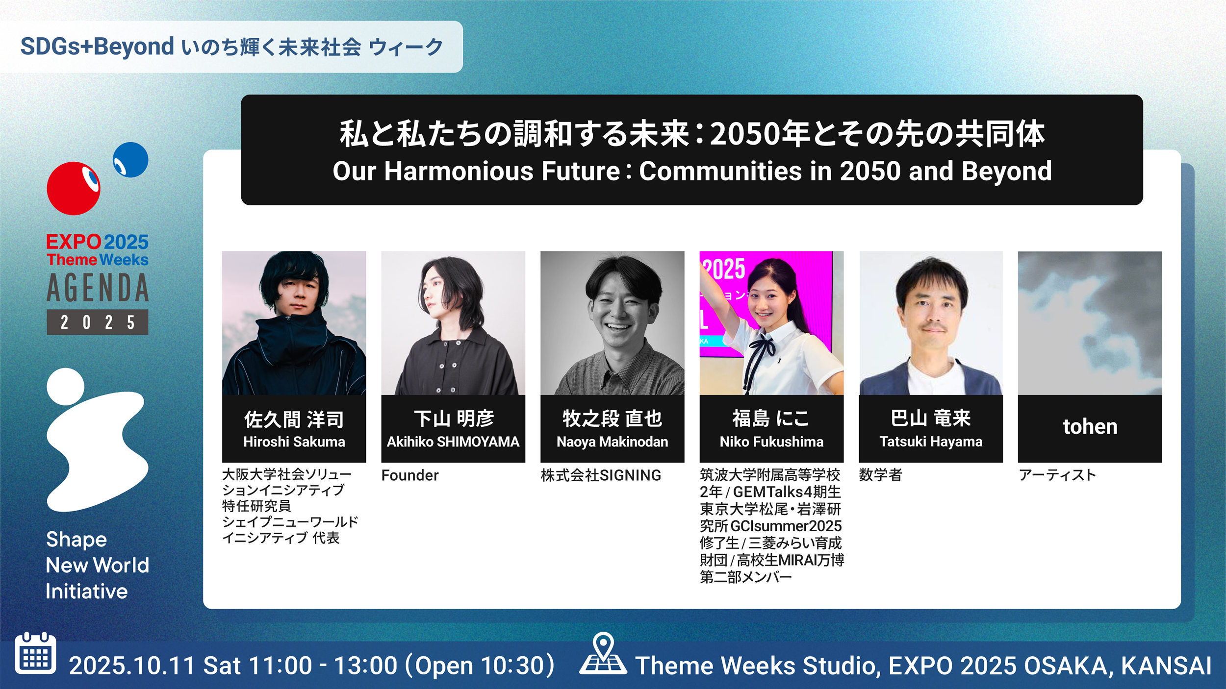 本セッション「私と私たちの調和する未来:2050年とその先の共同体」では、個と共同体の関係を再設計し、テクノロジーと文化の両面から「調和」を実装する道筋を検討しました。